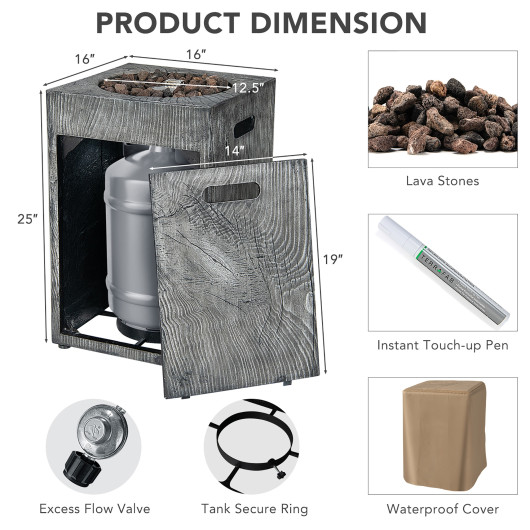 Made from sturdy steel and weather resistance ore powder material this gas fire pit can handle harsh weather conditions and high heat with ease. A rain cover is included to increase the fire pit’s longevity and maintain its appearance for years to come. With a control knob for easy flame adjustment and simple on-off controls you can find the most suitable temperature to enjoy your relaxing time outdoors. The ignitor requires a AAA battery (not included). And the ignition is very simple: step 1: attach to a 20lb propane gas cylinder(not included); step 2: turn the knob and press the ignition button. This propane fire pit with 30 000 BTU heat output will provide a warm experience for your family and friends whether it is late fall or cold winter. Note: please keep lava rock covered and dry to prevent any crackling during use. Cover the fire pit after it cools down.