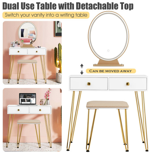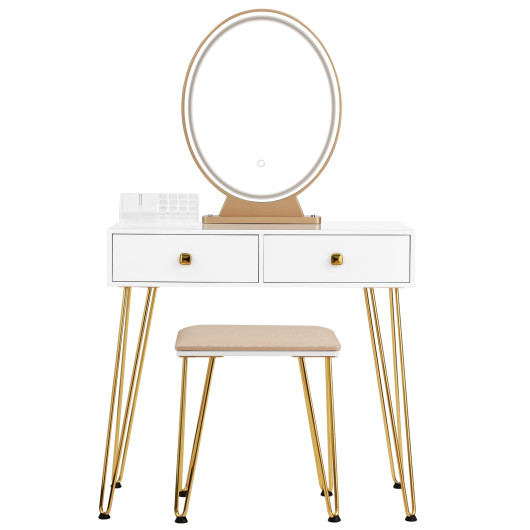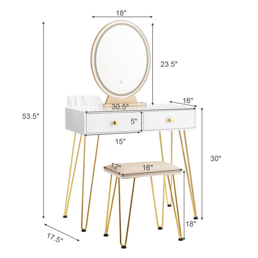 With a rustic and concise style this vanity set shows an unparalleled temperament will bring great personality to any room and will be the best addition to your bedroom while being ultra-functional and a joy to use. Designed with a touch screen dimming mirror the dresser enables you to do makeup even in a dark environment early in the morning while your partner is still sleeping without disturbing them. There are three lighting modes: natural warm and cold for you to choose. Equipped with 2 large drawers and combined with the desktop of large size large desk space the table provides spacious space spacious area for you to store cosmetics jewelry and other necessities. And the stool with a soft cushion will provide a comfortable seating experience.